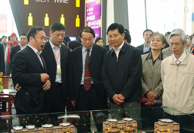 2013年原住建部副部长、中国房地产协会会长刘志峰参观集团项目展厅,韩素祥总经理向一行人汇报低碳建筑成果